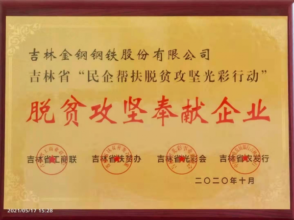 公司在吉林省“民企幫扶脫貧攻堅(jiān)光彩行動(dòng)”中,被吉林省工商聯(lián)、吉林省扶貧辦、吉林省光彩會(huì)、吉林省農(nóng)發(fā)行等聯(lián)合評(píng)為“脫貧攻堅(jiān)奉獻(xiàn)企業(yè)”。